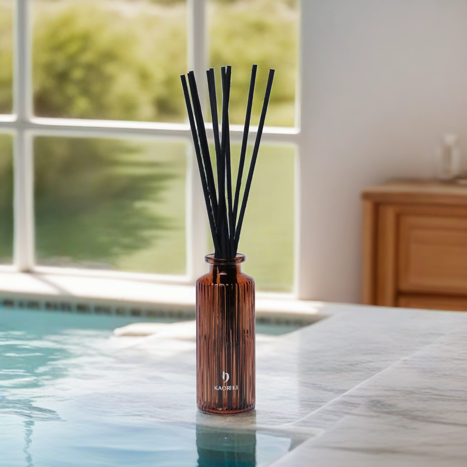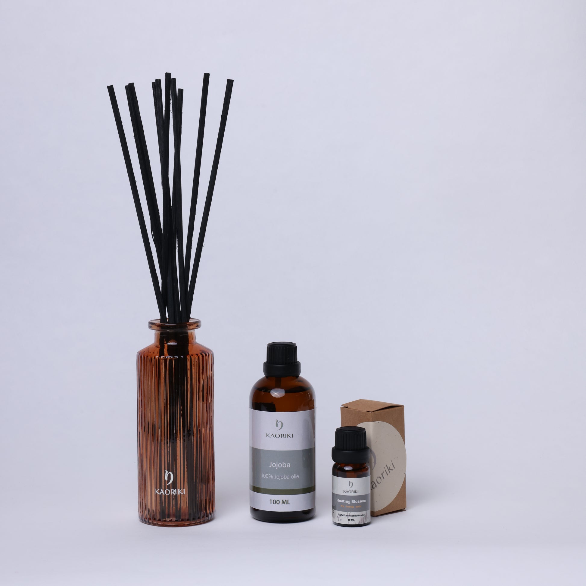 Bring lightness and softness into your home with Kaoriki's Floating Blossom Reed Diffusers . This refined set includes an amber diffuser bottle, black reed diffusers, organic jojoba oil, and our signature essential oil blend: Floating Blossom —a light, floral fragrance with notes of neroli, lotus, and white tea.