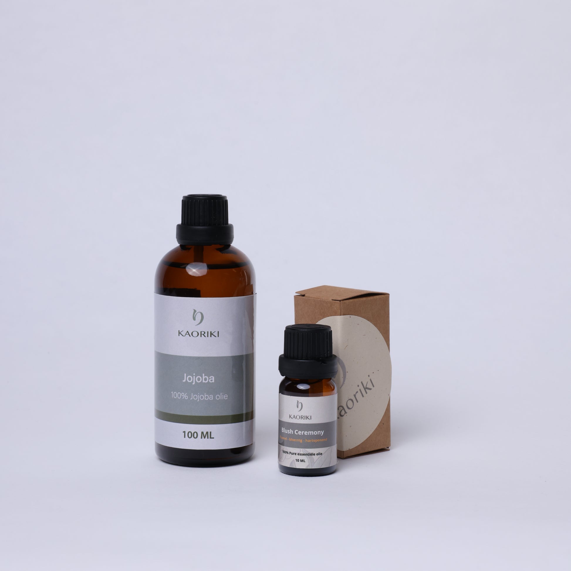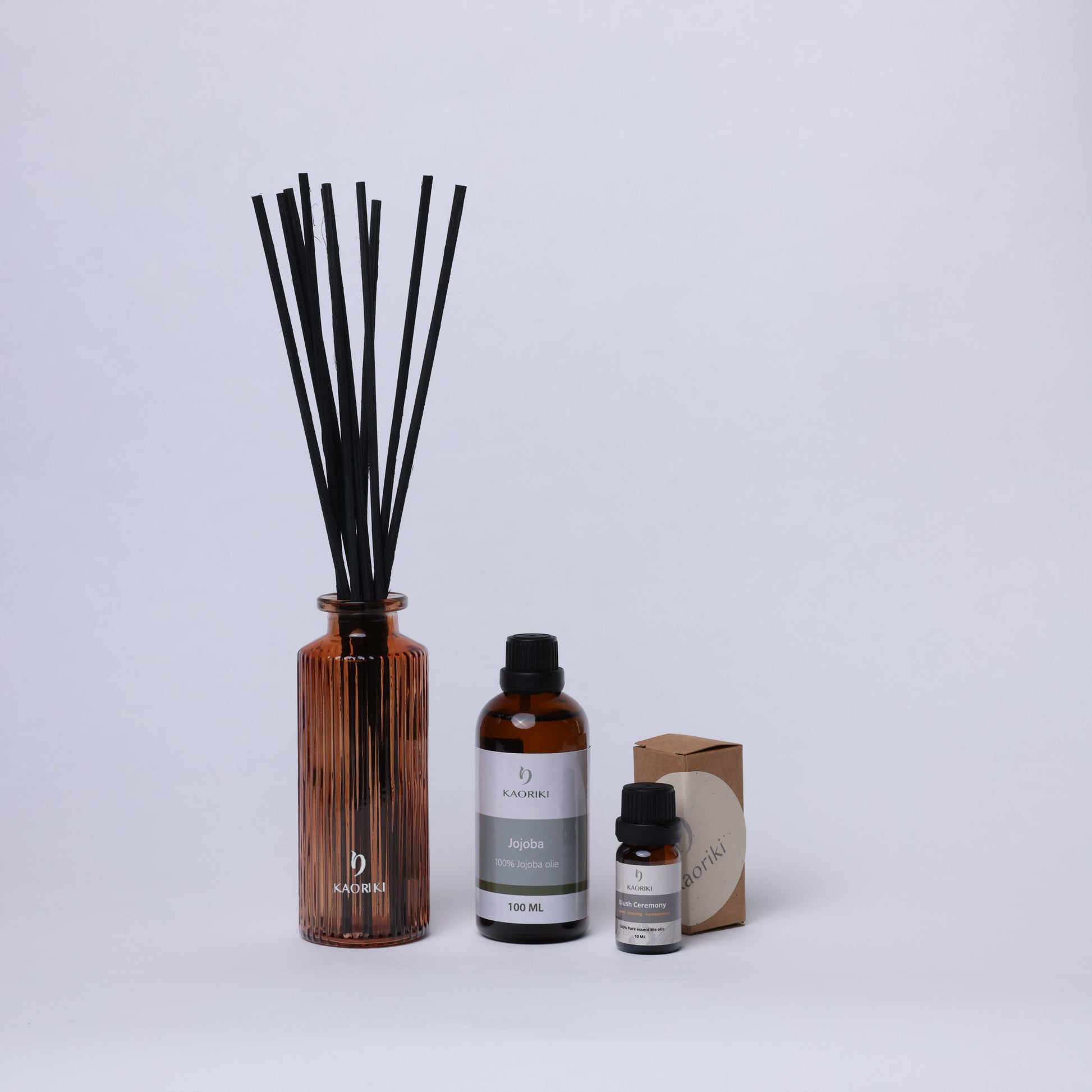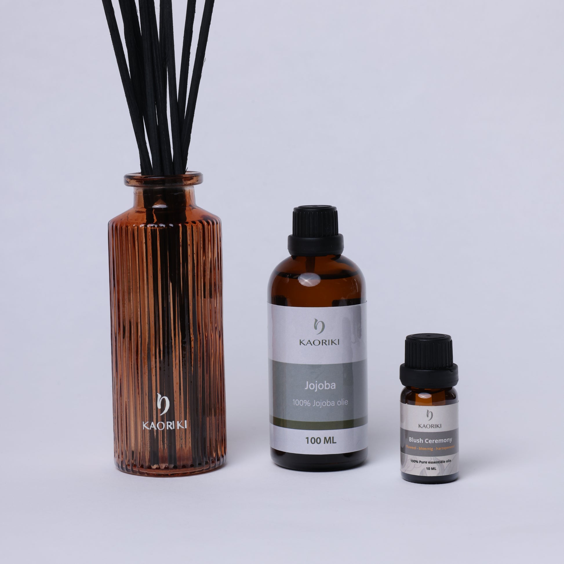Bring tranquility and ambiance to your space with Kaoriki's Blush Ceremony reed diffusers. This stylish set combines an amber diffuser bottle with black reeds, 100% organic jojoba oil, and our own essential oil blend: Blush Ceremony – a subtle, natural fragrance based on geranium, ylang ylang, and patchouli.