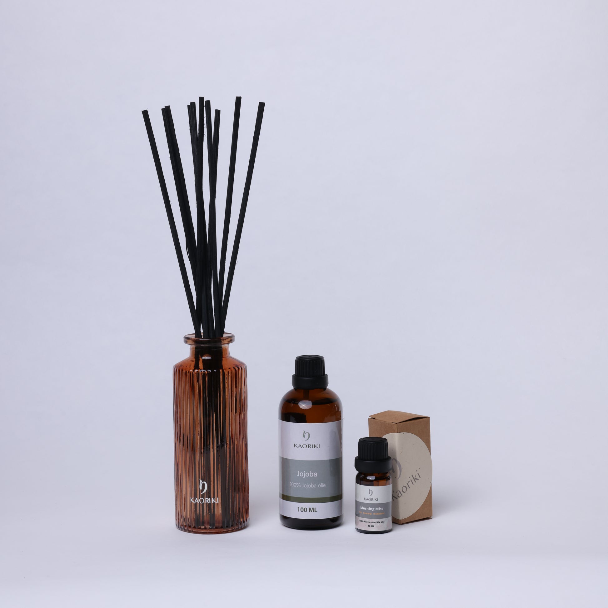 Bring clarity and calm to your day with Kaoriki's Morning Mist natural fragrance sticks. This refreshing set includes an amber diffuser bottle, black fragrance sticks, organic jojoba oil, and our own essential oil blend: Morning Mist —a light scent with notes of eucalyptus, mint, and bergamot.