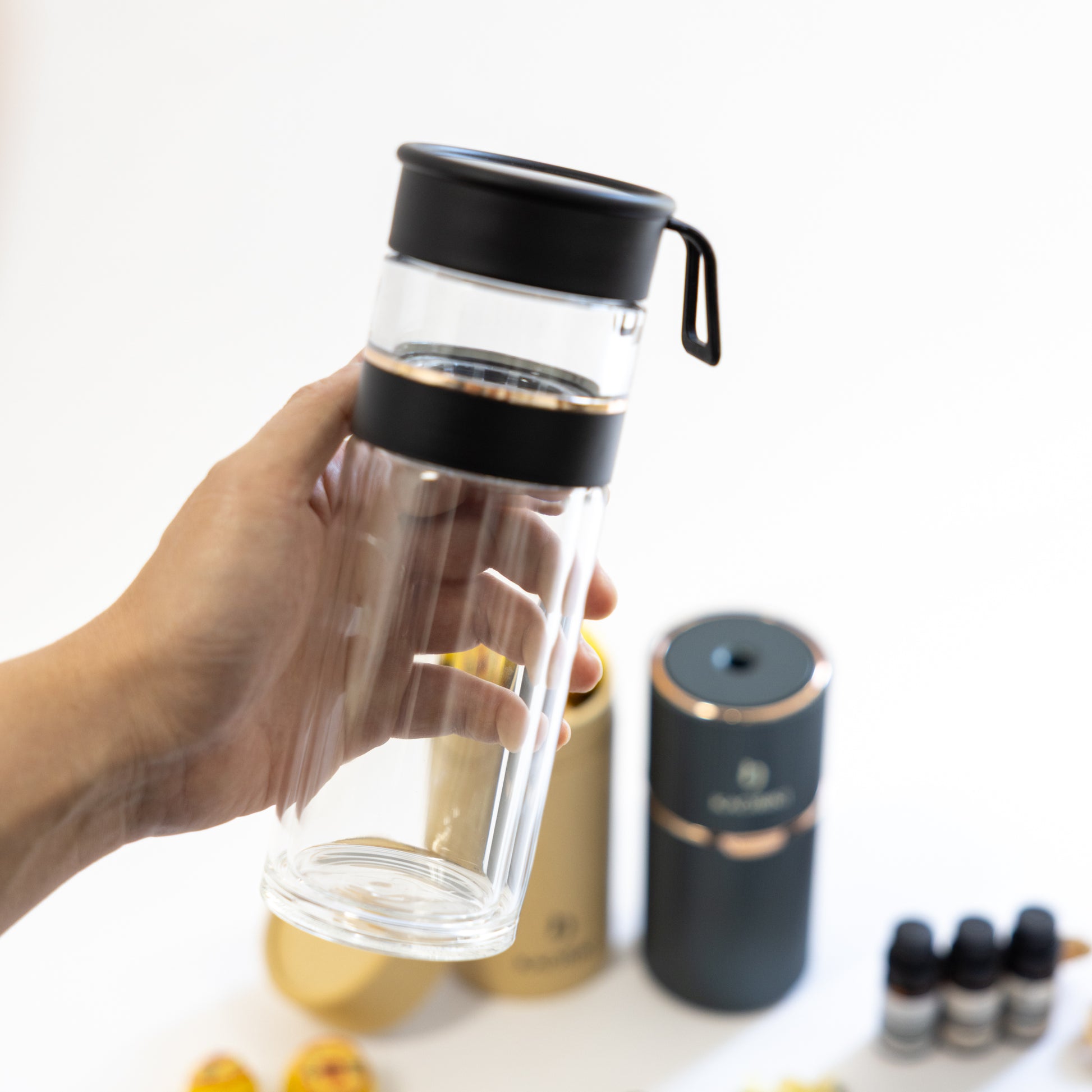 On the go gift box - wireless aroma diffuser 80 ml - Tea balls - glass drinking bottle 400 ml - 3 essential oils