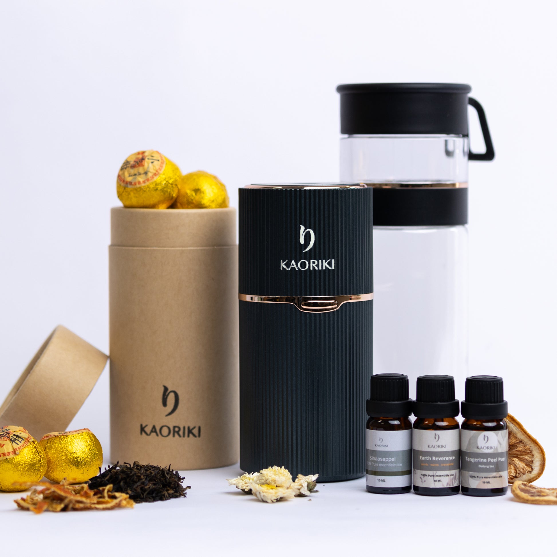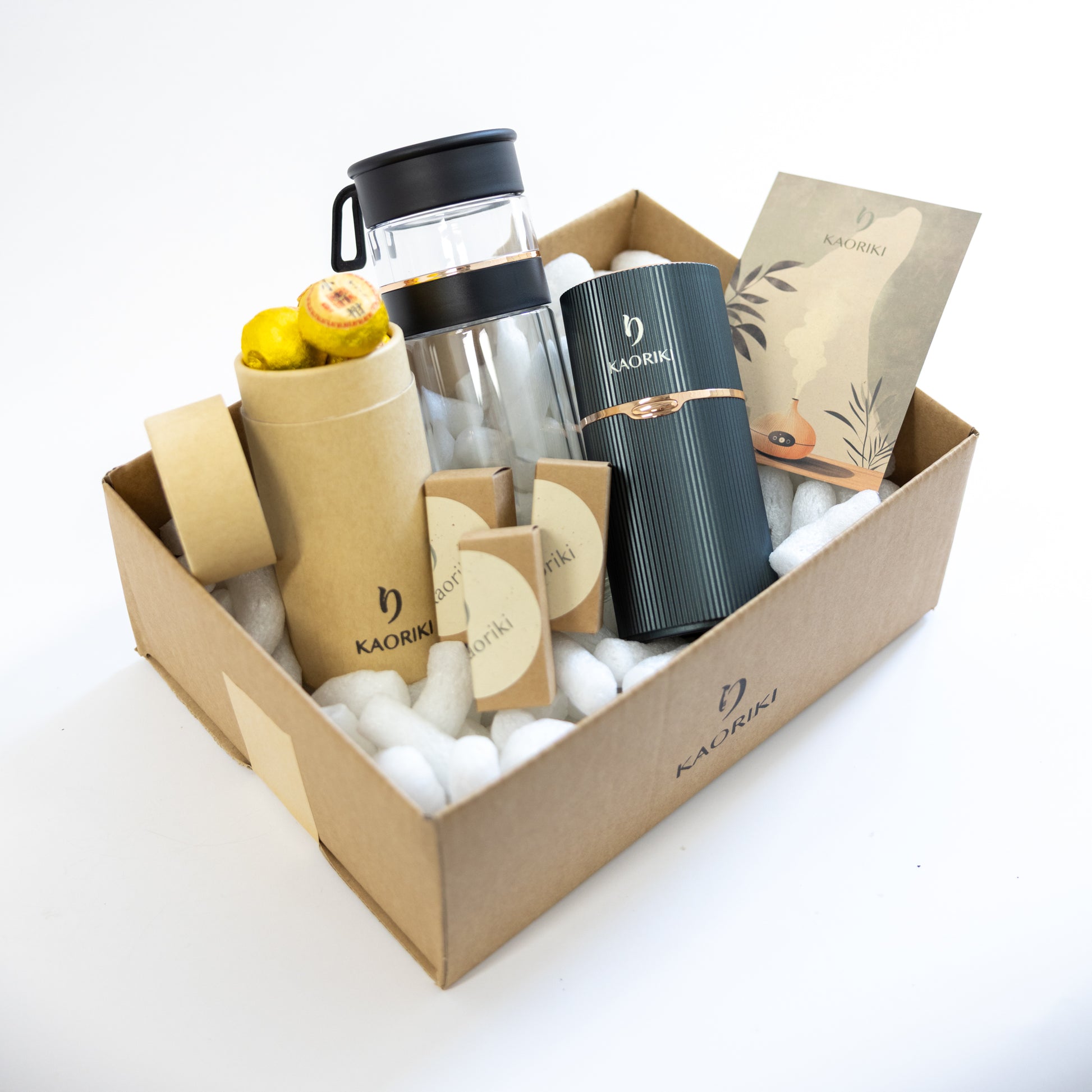 Featuring a stylish wireless aroma diffuser, a sustainable glass drinking bottle, natural tea, and essential oils, this is the perfect gift – or a treat for yourself.